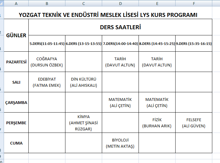 Okulumuzu son siniflari için hazirlanan 2013 LYS kurs programi asagidaki çizelgeye göre yapilacaktir. LYS katilacak tüm ögrencilerimizin programa katilmasi gerekmektedir.
